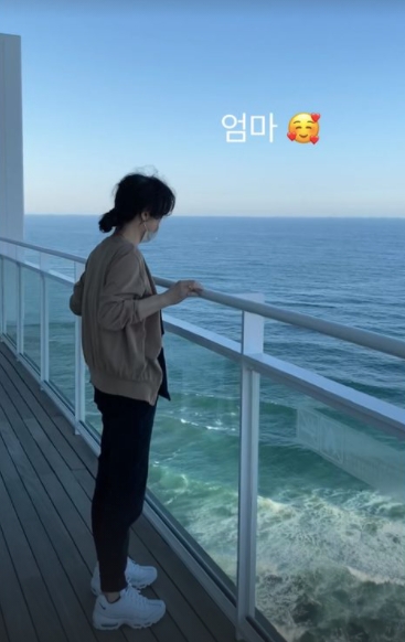 공개된 사진 속 한예슬의 엄마는 테라스에 서서 푸른 바다를 내려다보는 모습이다. 짧은 점퍼와 조거 팬츠로 딸 못지않은 스타일리시한 패션을 선보이고 있는 것.