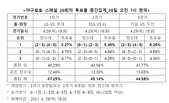 국민체육진흥공단이 발행하는 체육진흥투표권 스포츠토토의 수탁사업자 스포츠토토코리아가 29일(목)에 열리는 2021시즌 한국프로야구(KBO) 3경기를 대상으로 한 야구토토 스페셜 20회차 투표율을 중간 집계한 결과, 세 경기 모두 각 팀의 투표율이 40%대로 나타나 승부를 알 수 없는 접전들이 이어질 것으로 예상됐다고 밝혔다.