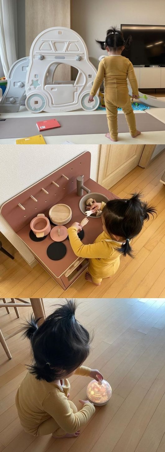 공개된 사진 속에는 올해 3살이 된 딸 셜록이의 앙증맞은 뒤태가 담겨 있다. 셜록이는 집안의 구석구석을 다니면서 놀거나, 장난감을 가지고 소꿉놀이를 하는 등 혼자서도 알차게 시간을 보냈다. 특히 엄마의 체력이 방전돼 뻗을 때도 지치지 않고 에너자이저급 기운을 자랑하기도 했다.