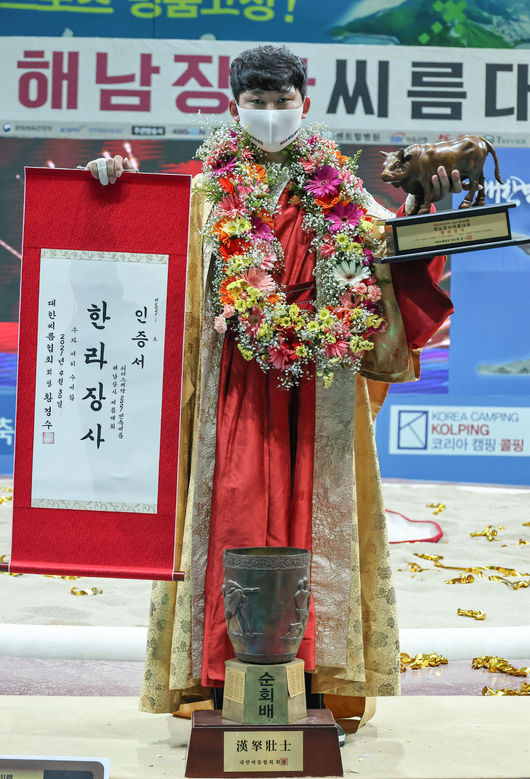 한편, 12번의 한라장사 타이틀을 보유한 영암군민속씨름단 김기태 감독은 오창록을 공격형 스타일의 제 2의 김기태로 키우겠다고 밝혔다. / 10bird@osen.co.kr
