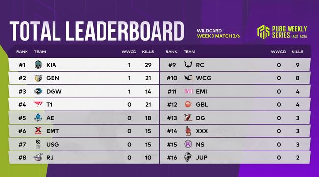 담원-젠지는 30일 오후 온라인으로 열린 ‘2021 펍지 위클리 시리즈: 동아시아(이하 PWS)’ 페이즈1 3주차 와일드카드전 3라운드까지 각각 치킨 1회를 획득하면서 1, 2위에 올라섰다. 특히 담원은 29킬을 확보하면서 파이널행 가능성을 매우 높였다.