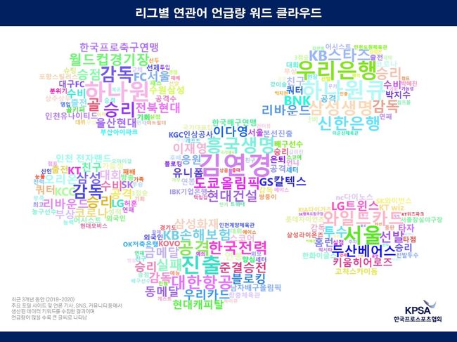 온라인 데이터 중 팬들의 관심사를 쉽게 알 수 있는 ‘연관어’ 분석 결과 K리그1과 WKBL은 메인 스폰서인 ‘하나원’과 ‘하나원큐’의 언급량이 1위로 나타났다. K리그2와 KBL은 ‘감독’, ‘승리’의 언급량이 1, 2위를 기록했다. KBO는 다수의 경기장이 위치한 ‘서울’이 1위에 올랐다. V리그의 경우 남자부는 ‘진출’, ‘공격’과 같은 경기 관련 단어가 상위에 올랐고, 여자부는 ‘김연경’ 등 인기 선수의 이름이 상위권에 올랐다. 단체종목 전체에서 인기 구단의 이름이 상위권에 올랐다. 프로골프는 남녀 공통으로 ‘우승’, ‘상금’이라는 단어가 상위권에 분포했으며, 여자골프는 인기 선수의 이름이 상위권에 올랐다.