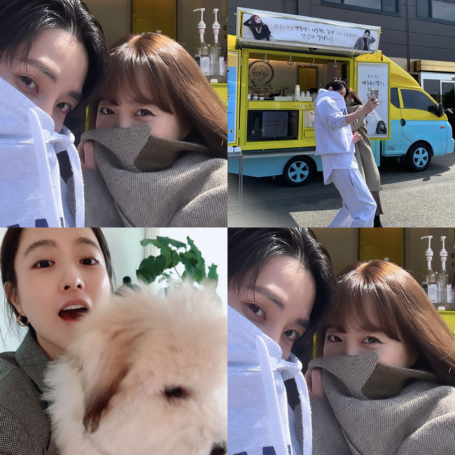 두 사람은 드라마 촬영장에 준비된 커피차 앞에서 다정하게 포즈를 취하고 있는 모습. 특히 옷으로 얼굴의 반을 가리며 마치 연인같은 포스로 카메라를 바라보고 있어 사랑스러움을 더한다.
