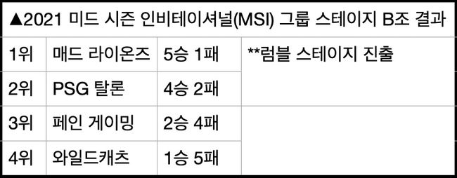 매드 라이온즈, PSG 탈론은 10일 오후(이하 한국시간) 아이슬란드 레이캬비크 뢰이가르달스회들 실내 스포츠 경기장에서 펼쳐진 ‘2021 미드 시즌 인비테이셔널(이하 MSI)’ 그룹 스테이지 5일차 경기까지 각각 5승, 4승을 확보하면서 럼블 스테이지에 진출했다.