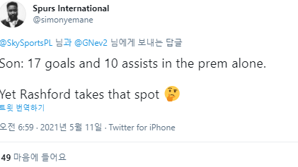 손흥민이 아니더라도 PL 득점 2위인 모하메드 살라(20골 4도움)나 인상적인 플레이 메이킹을 보인 잭 그릴리쉬(6골 10도움)가 래쉬포드보다 뛰어난 활약을 펼쳤다는 것이 중론이다.