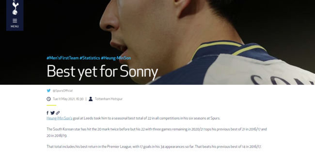 토트넘은 "리즈전 득점으로 손흥민은 토트넘에 있던 6년 동안 한 시즌 최다골 기록을 22골로 갱신했다"면서 "앞서 손흥민은 2시즌 동안 20골 이상을 기록했다. 하지만 3경기 남은 시점에서 22골은 그의 커리어 최고 기록"이라고 강조했다.