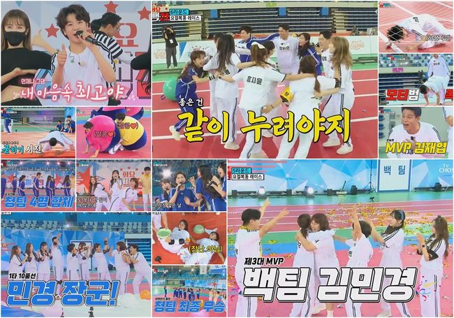 마지막으로 최종 승부를 결정짓는 ‘요절복통 레이스’가 그려졌다. 하지만 각 팀의 파이팅 넘치는 구호로 가동된 대결에서 청팀 김수찬이 훌라후프를 연이어 떨어뜨리는 실수로 시간을 지체시켰고, 그 사이 백팀이 스피드를 내면서 최종 승리를 따냈다. 이후 선수단 투표를 통해 김재엽이 MVP 타이틀과 드럼세탁기를 획득했다.
