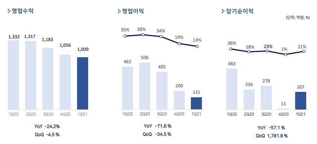 펄어비스는 12일 실적 발표를 통해 2021년 연결기준 1분기 매출 1,009억원, 영업이익 131억원을 달성했다고 밝혔다.