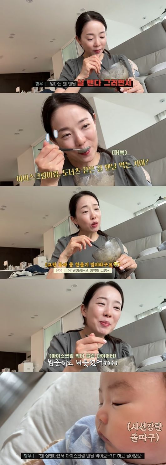 이에 박은영은 "나 살 뺄거야. 당이 떨어지는 걸 어떡해"라며 "범준이도 비웃었어"라며 웃었다. 남편 김형우는 "말로만 살 뺀다고 그런다"며 "엄마한테 '왜 살 뺀다면서 아이스크림 맨날 먹어요?' 물어봐"라고 덧붙여 웃음을 선사했다.