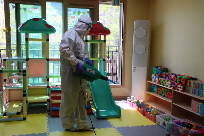지역사회 내 코로나19 확산 방지를 위해 김천상무는 김천시 내 어린이집 중 희망 어린이집들을 대상으로 어린이집 안팎 소독을 진행하고 원생에게 KF94 소형 마스크를 제공했다.