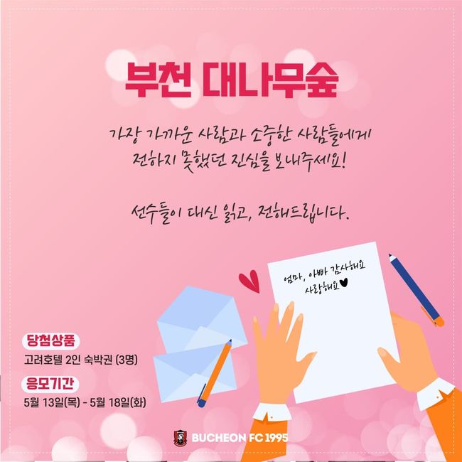 부천FC1995가 5월 가정의 달을 맞아 팬들을 대상으로 소중한 사람들에게 감사의 메시지를 전하는 ‘부천 대나무숲’ 온라인 이벤트를 진행한다.