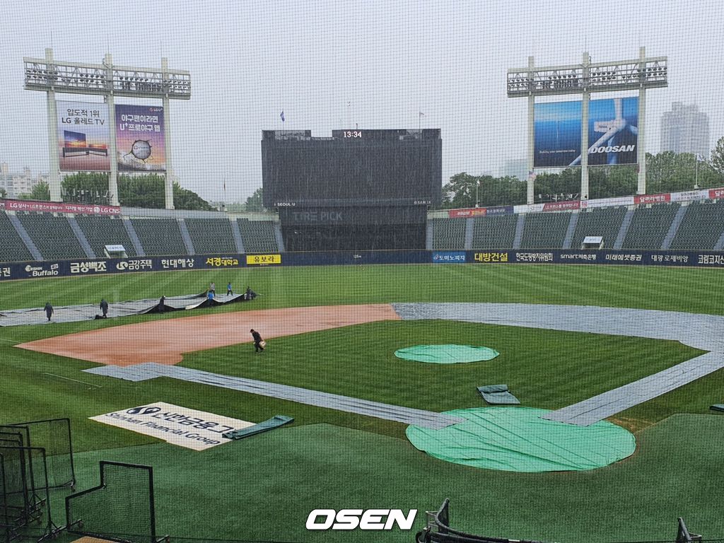 잠실구장에 갑자기 많은 양의 비가 쏟아지기 시작했다.