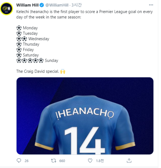 영국 축구 도박 업체 '윌리엄 힐'은 19일(한국시간) "켈리치 이헤아나초는 잉글랜드 프리미어리그(PL) 역사상 처음으로 한 시즌 동안 모든 요일에서 득점에 성공했다"고 보도했다.
