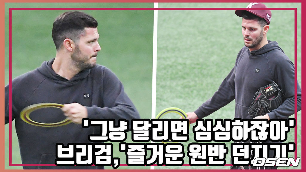 브리검은 23일 오후 서울 고척스카이돔에서 열리는 ’2021 신한은행 SOL KBO 리그' NC 다이노스와의 홈 경기를 앞두고 동료들과 원반 던지기로 훈련을 했다.