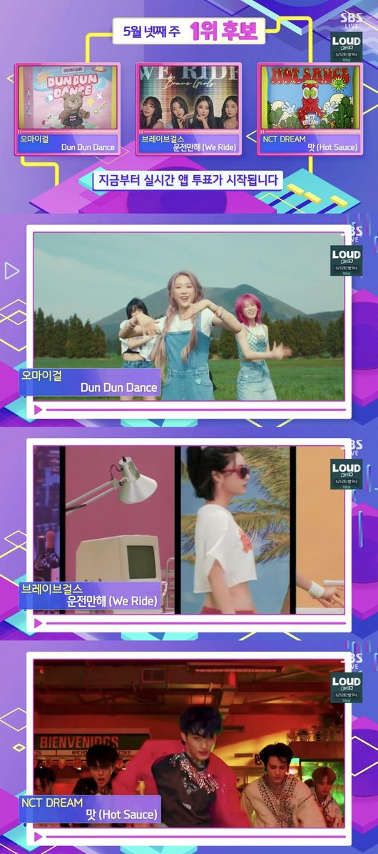 이날 오마이걸은 ‘DUN DUN DANCE’로, 브레이브걸스는 '운전만해', NCT DREAM은 '맛(Hot Sauce)'으로 1위 후보에 올랐다.