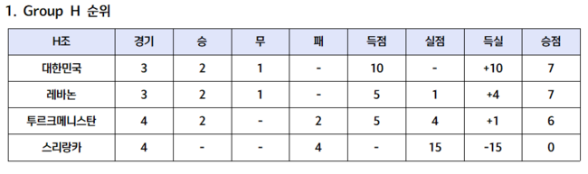 한국은 승점 7(2승1무)로 레바논과 동률이 됐으나 골득실(한국 +10, 레바논 +4)에서 앞서 선두가 됐다. 투르크메니스탄은 북한전 3-1 승리 기록이 제외되면서 승점 6(2승2패)이 돼 3위로 내려섰다. 스리랑카가 승점 0(4패)으로 최하위다.