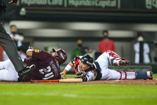 KIA 내야진은 전진 수비를 펼쳤다. 김혜성의 빠른 타구를 잡은 2루수 김선빈이 홈에 볼을 뿌렸다. 경험이 돋보이는 순간이었다. 약간 볼이 치우쳤다. 볼을 받은 포수 김민식은 의외의 플레이를 했다. 3루주자 프레이타스의 태그를 시도한 것이다. 프레이타스가 몸을 돌려 피하며 홈플레이트를 터치했다.