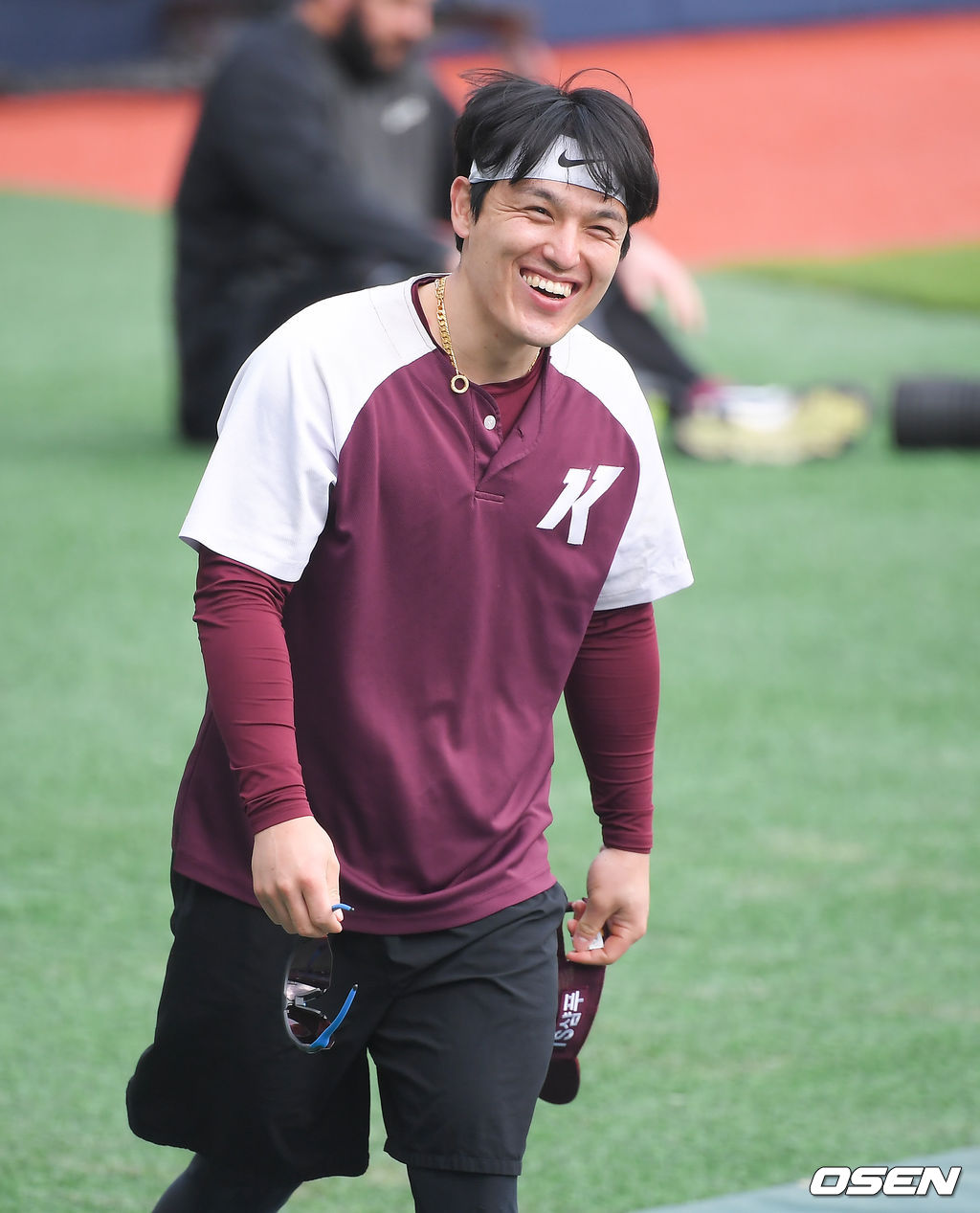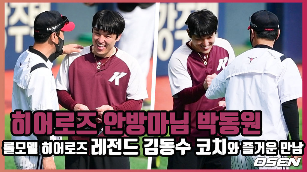 28일 오후 서울 잠실구장에서 진행되는 2021 신한은행 SOL KBO리그 LG 트윈스와 키움 히어로즈의 경기를 앞두고 LG 김동수 코치와 키움 박동원이 반가운 인사를 했다.