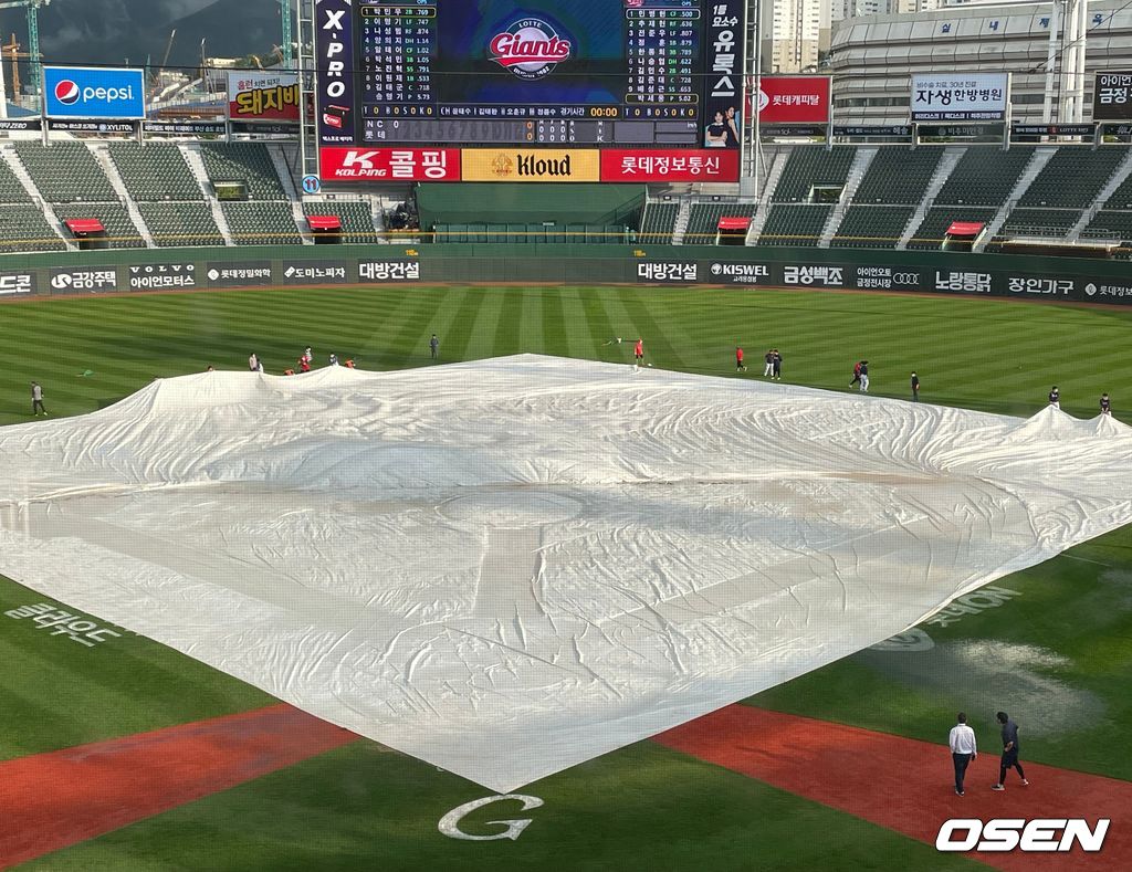 하지만 지나가는 비구름으로 일시적인 폭우였고 금세 그쳤다. 이후 햇빛이 사직구장을 비추기 시작하면서 경기 개시를 준비하고 있다. 한용덕 경기감독관은 그라운드 상태를 면밀히 체크하기 시작했고 경기 개시 시점을 고심하고 있다.