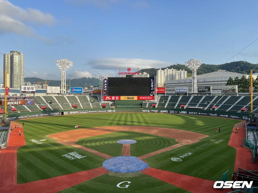 그러나 오후 5시 즈음부터 사직구장에 폭우가 쏟아졌다. 단시간에 엄청난 양의 빗줄기가 퍼부었다. 비는 금세 그쳤지만 그라운드가 엉망이 됐다. 방수포가 없는 외야 워닝트랙에는 물웅덩이가 곳곳에 생겼다.