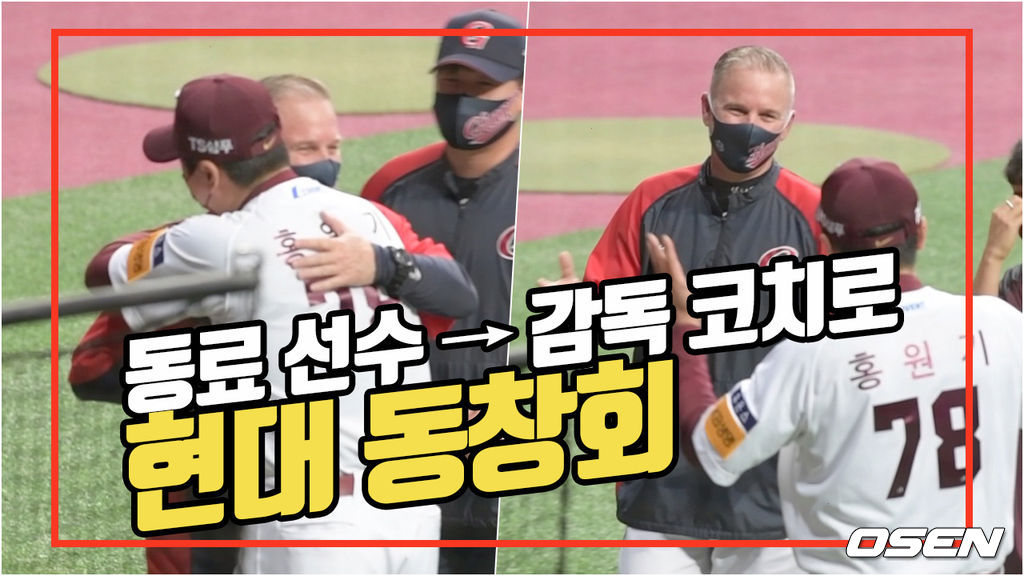 경기에 앞서 허문회 감독에 이어 롯데의 사령탑을 맡게된 서튼 감독이 그라운드에서 키움 홍원기 감독, 강병식 코치와 만나 반가운 인사를 나눴다.