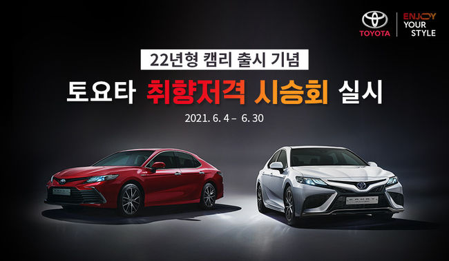 토요타코리아가 2022년형 캠리 출시를 기념해 6월 4일부터 30일까지 ‘취향저격 시승회’를 연다. 토요타 공식 홈페이지와 어플리케이션에서 신청하고 전국 토요타 공식 딜러 전시장에서 체험할 수 있다.
