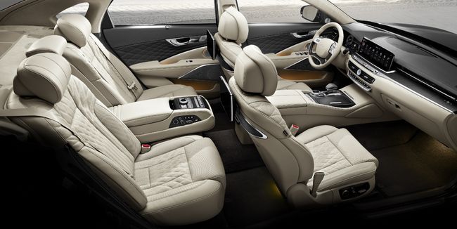 외장은 대형 라디에이터 그릴에 V 형상의 정교한 크롬 패턴을 적용해 플래그십 세단의 존재감을 강조했고, 후면은 좌우 수평으로 리어램프를 연결해 와이드한 느낌을 살리는 동시에 세련된 분위기를 연출했다.