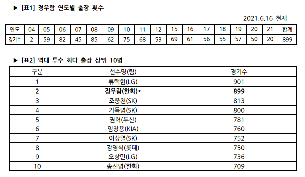 역대 KBO리그에서 900경기 이상 등판한 투수는 LG에서 은퇴한 좌완 류택현밖에 없다. 정우람이 기록을 달성할 경우 900경기 출장에 도달하는 두 번째 투수가 된다.
