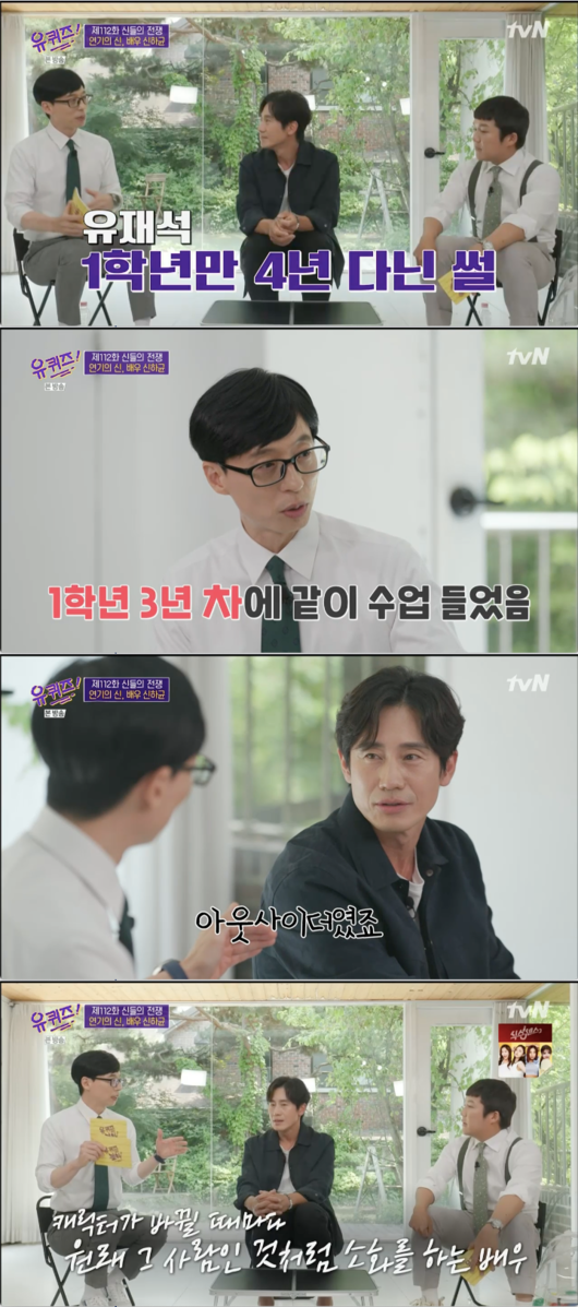 서울예대 동문인 유재석과 신하균. 유재석은 “원래 제가 제대로 졸업했으면 만날 수가 없었다”라고 말했고, 신하균은 “제가 말이 없고 아웃사이더였다”라고 말했다.