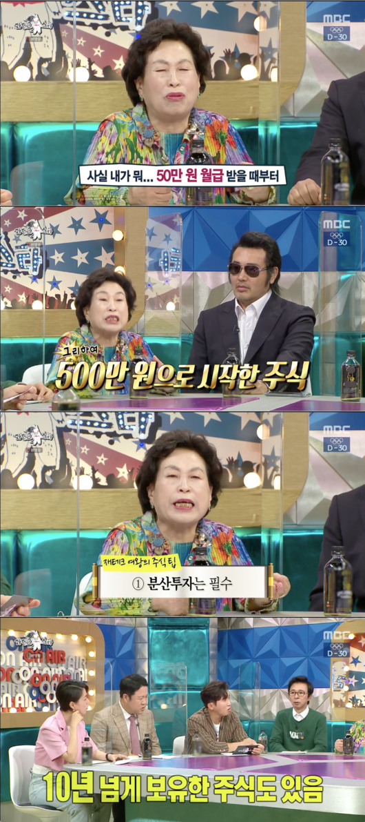 전원주는 “정말 저는 돈이 아쉬웠다. 어린시절 힘들었다. 돈의 중요성을 그때부터 느꼈다. 500만원으로 주식을 시작했다. 나는 분산투자를 해야겠다고 생각했다. 팔지 말고 모아라. 손해보더라도 기다려라. 10년을 기다린 것도 있다”라고 말했다.