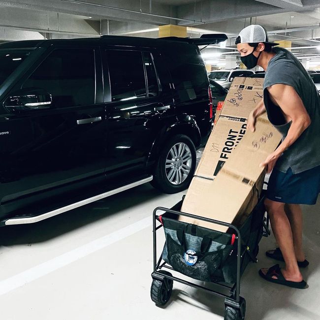 공개된 사진 속 이기우는 편안한 옷차림에 슬리퍼를 신고 주차장에서 카트로 물건을 옮기고 있다. 민소매에 드러난 건강미 넘치는 팔근육이시선을 사로잡는다.