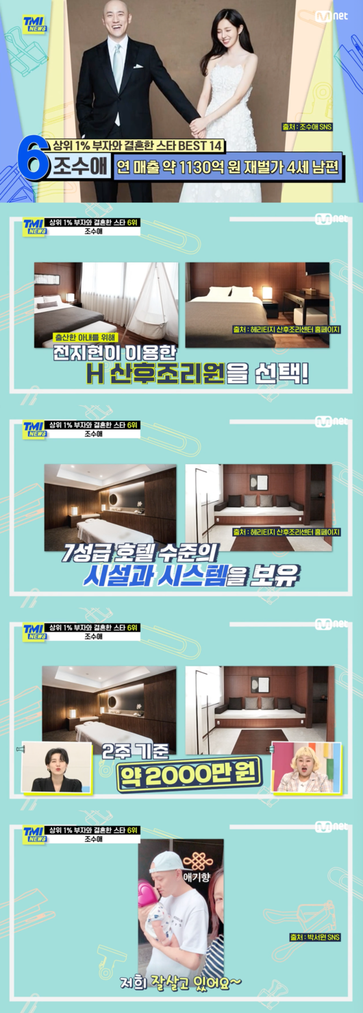 특히 재벌가 자제답게 조수애에게 특별한 사랑을 보여줬다고. 출산한 아내를 위해 배우 전지현이 이용한 산후조리원을 선택했다. 이 곳은 7성급 호텔 수준의 시설과 시스템을 보유, 조리원계의 넘사벽이다. 2주 기준 2천만원이라고.