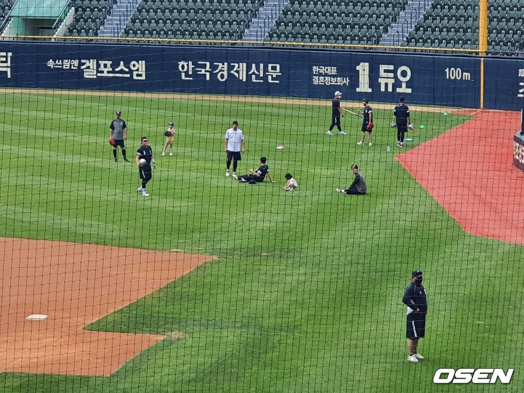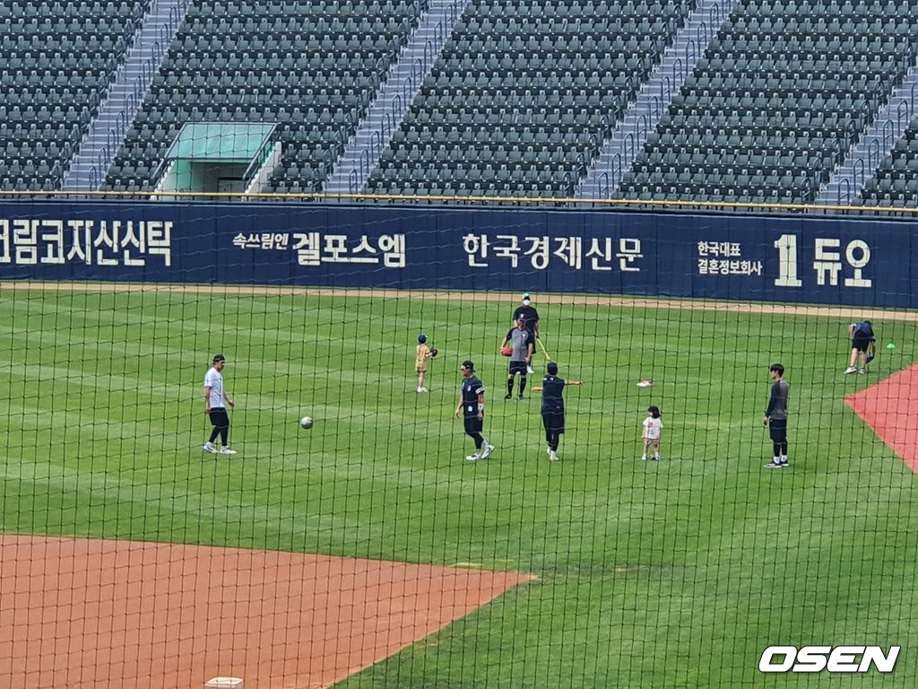 김재호가 자녀 2명을 그라운드까지 데려온 것이다. 한 명은 글러브를 끼고 두산 선수들과 공을 주고 받기도 했다. 이 장면만 모면 무슨 가족행사, 피크닉 모임 같았다. 코로나19가 4차 대유행 상황에서, 4단계 거리두기까지 격상돼 있는 사회 분위기와는 딴판이었다.