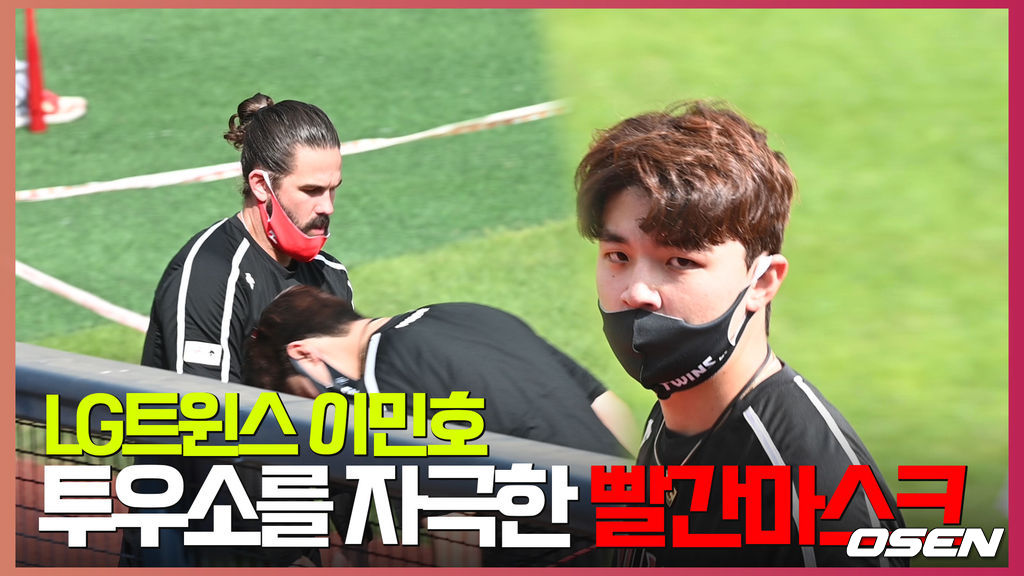 경기에 앞서 LG 이민호가 같은 팀 투수 켈리와 장난치는 모습을 영상에 담았다.