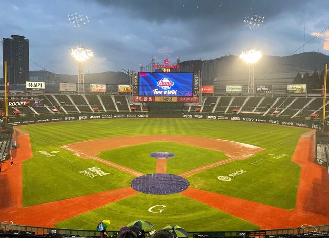 오전부터 우중충한 날씨 속에서 경기를 준비했다. 오후 6시 30분 경기 개시 선언을 할 때가지만 하더라도 별 다른 징후가 없었다. 하지만 1회말 롯데의 공격 도중 갑작스럽게 빗방울이 떨어지기 시작했고 굵어졌다. 결국 전일수 구심은 경기를 중단시켰다.
