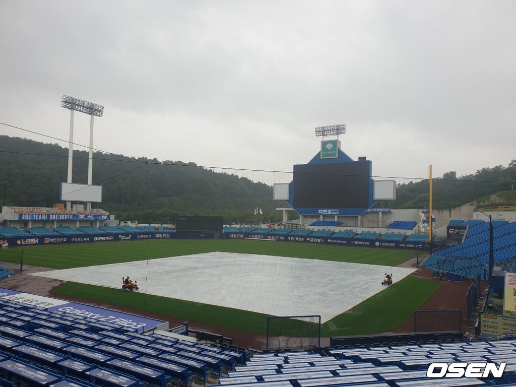 제12호 태풍 ‘오마이스’의 영향으로 대구지역에는 새벽부터 폭우가 쏟아지고 있다. 오후 3시 30분 현재 대구삼성라이온즈파크는 대형 방수포가 깔려 있고 그라운드 곳곳에 물웅덩이가 생겼다.