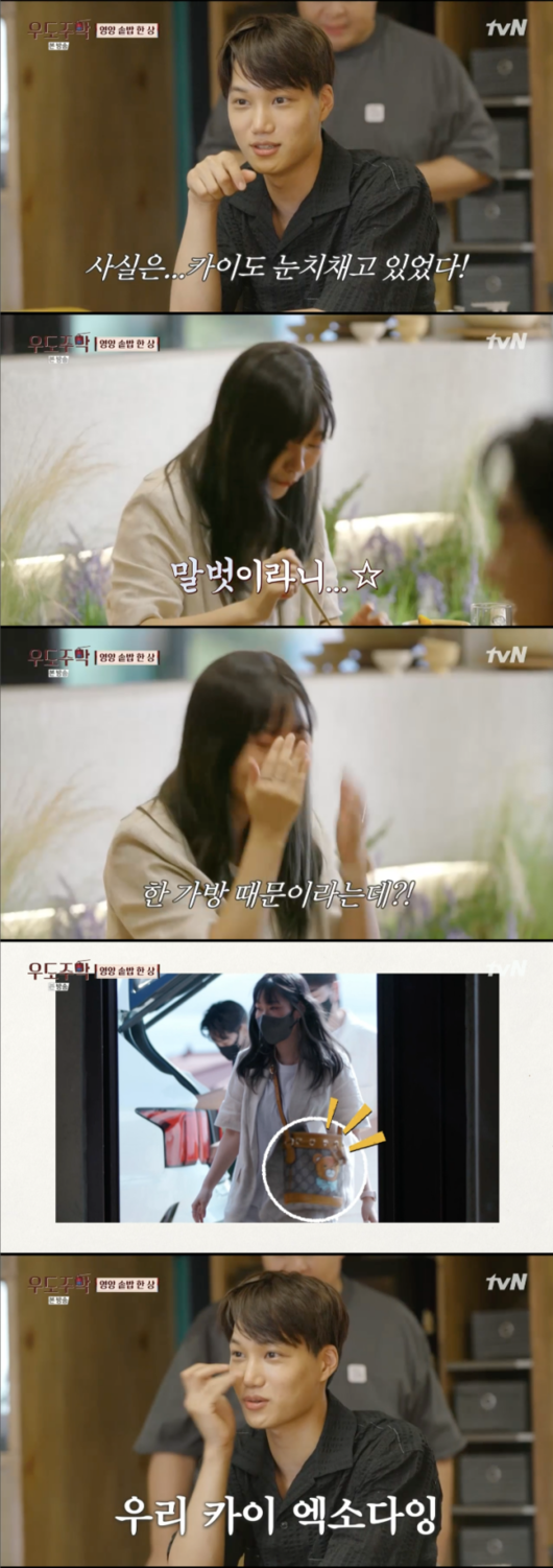 카이는 손님이 메고 온 가방을 보고 팬임을 눈치챘다고. “저거 내가 콜라보 했던 제품인데?”라고 말하며 반가움을 드러냈다. 이에 아내는 “남편이 여기 오니까 팬인거 티내라고 사줬다”고 말했다. 이에 카이는 “너무 영광이다”라며 감사의 마음을 표했다.