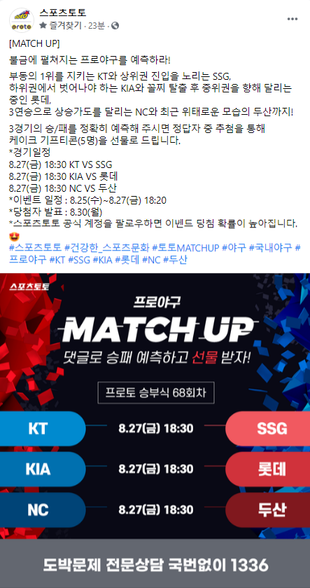 국민체육진흥공단이 발행하는 체육진흥투표권 스포츠토토의 수탁사업자인 스포츠토토코리아가 공식 페이스북(www.facebook.com/sportstoto.toto.proto)을 통해 오는 27일(금)에 열리는 국내프로야구 KBO리그 3경기를 대상으로 경기 결과를 맞히는 ‘MATCH UP’ 이벤트를 진행한다고 25일 밝혔다.