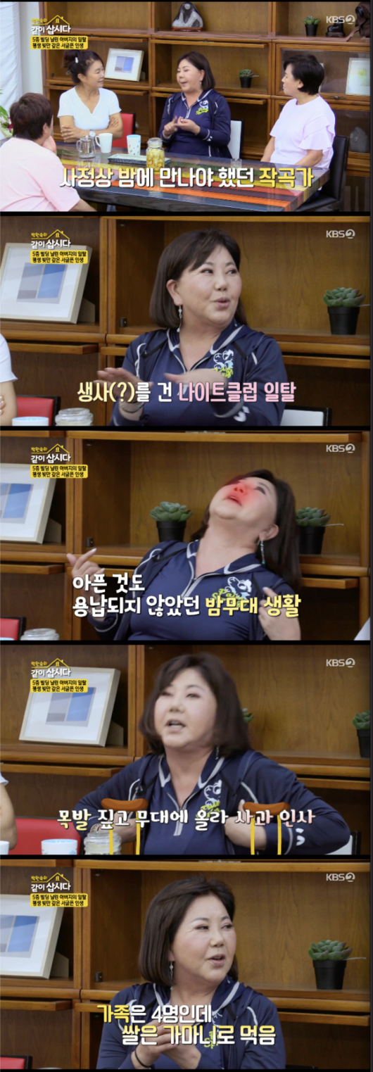 이은하는 “우리가족은 엄마, 아버지, 남동생, 나 4명이었는데 쌀은 가마니로 먹었다. 그때 당시 일가친척 생계까지 책임졌다. 일이 없어서 어쩔 수가 없었다. 온 집안이 저만 바라보는 상황이었다. 버는 만큼 돈이 엄청 나갔다.”고 말했다.