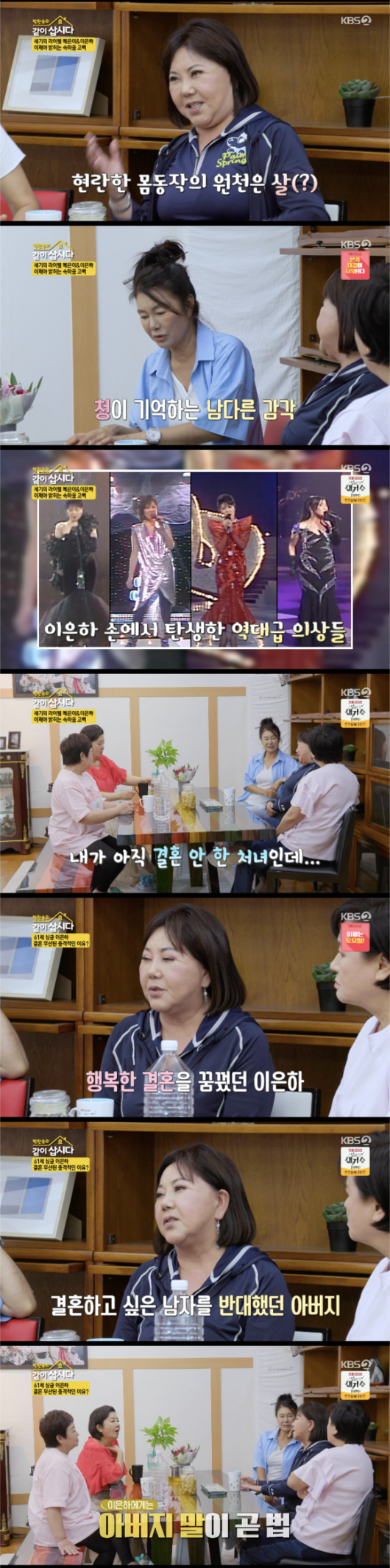 박원숙은 “감정 가지고 노래해야 하는 직업인데 한 맺힌 덕에 감정은 풍부했겠다”고 말했다. 이은하는 “평생 일만 하고 살았다”고 말했다. 박원숙은 “최선을 다해서 살았다. 그거 모르는 사람 없다.”고 위로했다. 이은하는 “수입의 10분의 1을 용돈으로 받아 썼다.의상 준비까지 용돈으로 해결했다.”고 말했다.