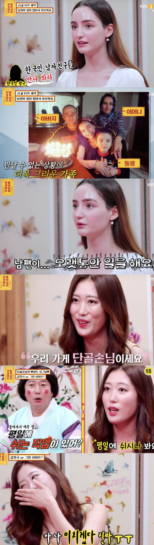 터키 새댁의 고민을 물었다. 그는 “남편과 너무 행복한데 오랫동안 일하는 남편 때문에 혼자 집에 있으면 너무 외로워서 계속 운다”면서 고민을 전했다. 남편과는 8살 나이 차이로 남편은 요리사라고 했다.