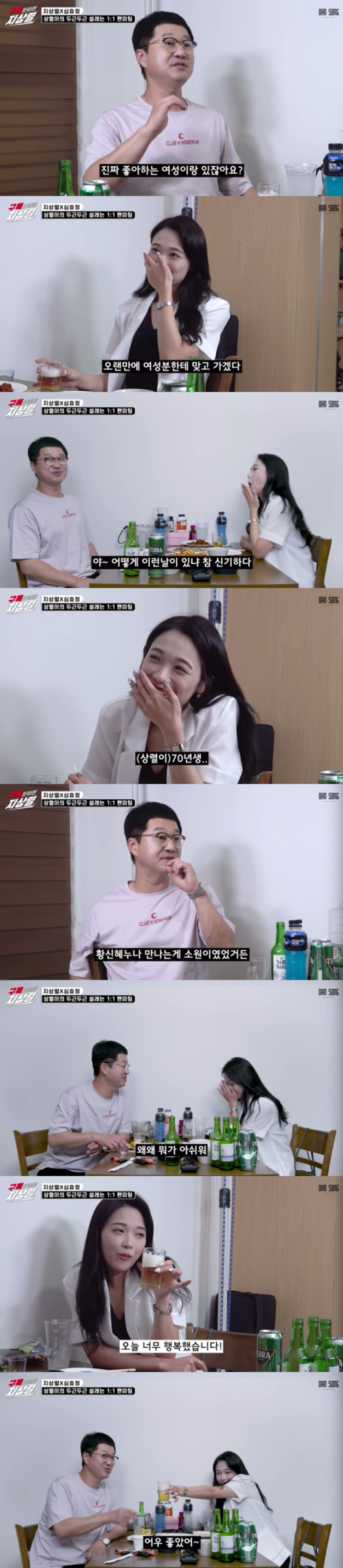 여성은 지상렬에게 은근 여자들에게 인기 많은 스타일이라고 칭찬을 아끼지 않았다. 그는 “옛날 ‘마실’ 유튜브 콘텐츠를 봤다. 이거 진짜 레알이구나 싶더라. 그전까지는 상렬 오빠를 잘 몰랐는데 너무 재밌더라. 같이 술 먹으면 재밌겠다 싶었는데 지금 현실이 됐다”며 감격했다.
