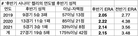켈리는 3년간 후반기 27경기에서 QS를 23회, 무려 85%나 기록했다. 게다가 QS에 실패한 4경기는 모두 6이닝 4실점, 선발 투수로서 크게 무너진 경기는 단 한 번도 없었다. 어쩌다 한 번이 아니라 3년 내내 전반기 다소 부진해도 후반기에는 놀라울 정도로 ‘QS 머신’이 되는 것이다.