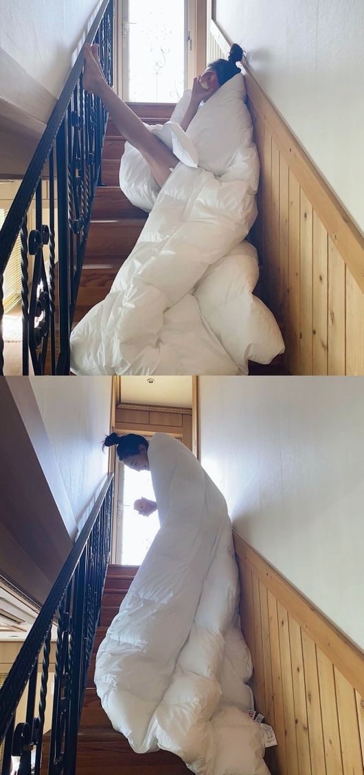 공개된 사진 속 진재영은 시댁에 방문, 2층으로 올라가는 계단에 앉아 다양한 자세로 사진을 찍는 모습이다. 군살 없이 쭉 뻗은 각선미가 시선을 끌며, 행복한 미소가 인상적이다.