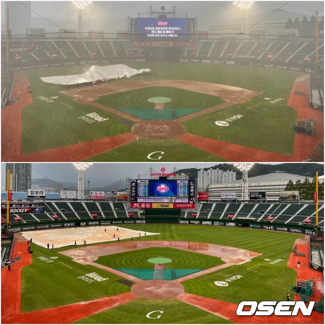 22일 부산 사직구장에서 열릴 예정인 삼성과 롯데의 올 시즌 마지막 맞대결을 앞두고 갑작스럽게 폭풍우가 찾아왔다. 그라운드 정비로 정시 경기 개시는 불가능해졌다. 30분 미뤄진 오후 2시 30분에 경기가 개시될 예정이다.