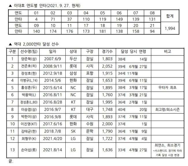 한편 이대호는 통산 2000안타와 더불어 연속 시즌 100안타 기록도 동시에 도전한다. 현재 두 기록에 모두 안타 6개가 부족하다. 해외에 진출했던 2012~2016년을 제외하고 2004년부터 12년 연속 100안타 기록이 이어져 통산 2000안타를 기록한다면 역대 9번째 13년 연속 100안타 기록도 동시에 달성하게 된다.