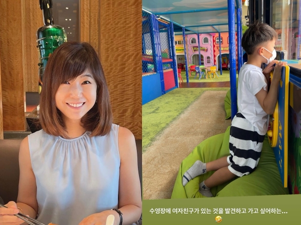 공개된 사진 속 강수정은 아들과 함께 키즈카페에 간 모습이다. 강수정의 아들은 놀이기구에 집중하지 못 하고 창밖을 바라보는 모습. 그 이유는 외부 공간에 있는 수영장에 여자친구가 왔기 때문이다.