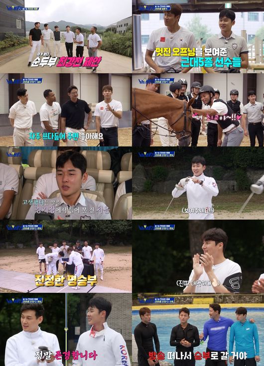 마지막으로 펼쳐진 근대 5종 선수들 간의 자존심 대결에서는 막내 전웅태가 마침내 1승을 획득, 사이 좋게 모두 한 번씩 승리하며 기분 좋게 대결을 마무리했다. 구본길과 대결한 느낌을 묻자 정진화는 “아우라가 있다”고 고백했고 전웅태 역시 “금빛 후광이 느껴진다”며 동조하며 그를 향해 존경 어린 시선을 보냈다.