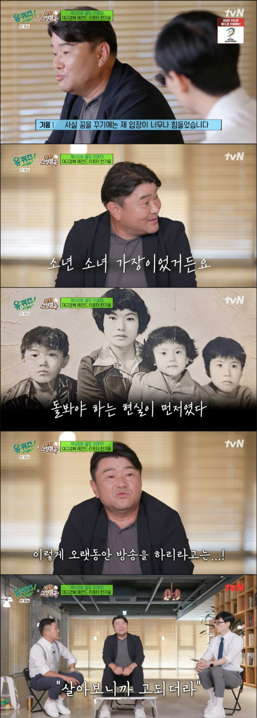 레전드 리포터 한기웅이 등장했고 “대구 경북에서 방송을 하는 한기웅입니다”라고 말했다. 한기웅의 딸은 아버지의 유퀴즈 출연 소식에 “너무 기뻤지만 ‘보이스피싱이 아닐까’라는 생각을 했다”라고 말해 웃음을 자아냈다.