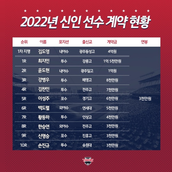 KIA는 아울러 2차지명 1라운드 최지민(강릉고.투수)와는 계약금 1억5000만원, 연봉 3000만원에 계약했다.